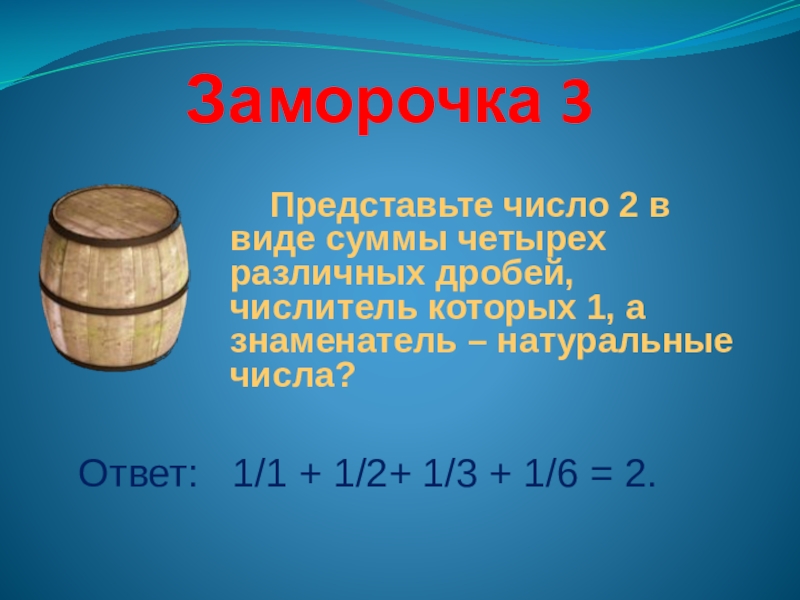 Ответ: 1/1 + 1/2+ 1/3 + 1/6 = 2.