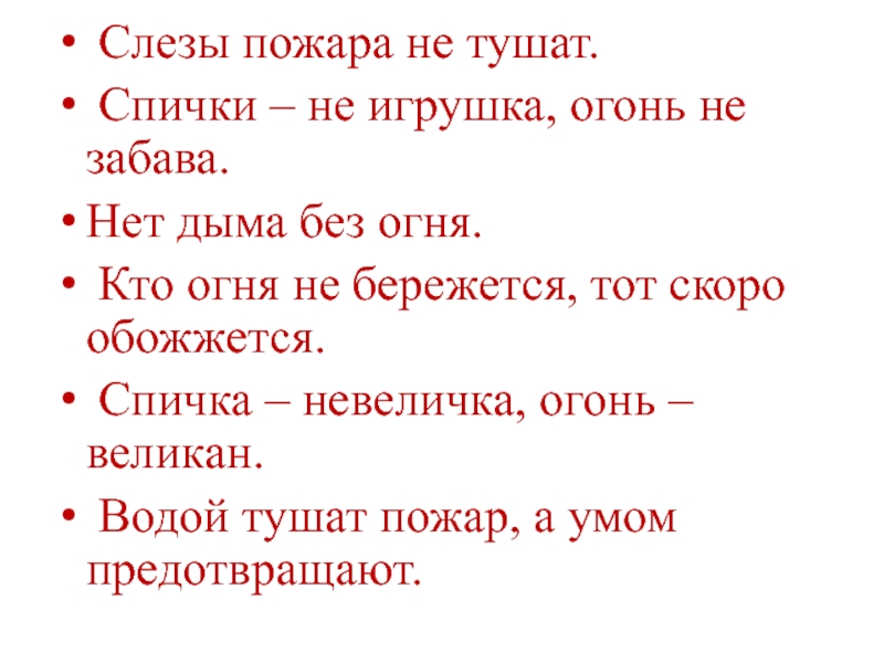 Слезы пожара не тушат. Спички – не игрушка, огонь не забава.Нет дыма без огня. Кто огня не бережется, тот