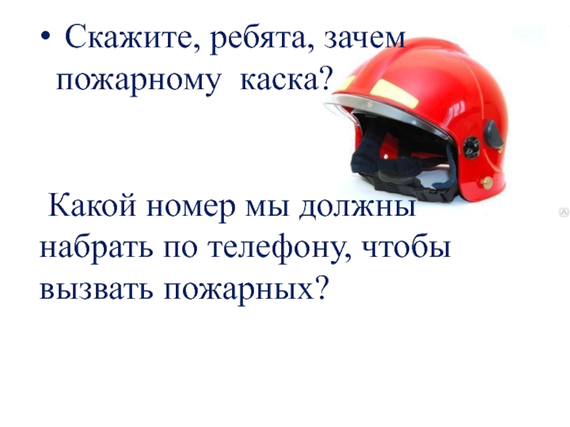 Скажите, ребята, зачем пожарному каска? Какой номер мы должны набрать по телефону, чтобы вызвать пожарных?