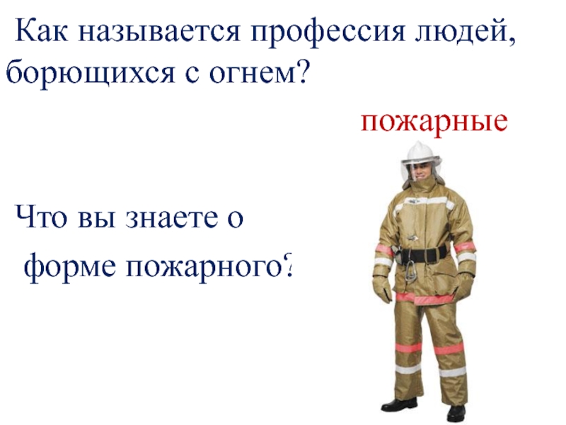 Как называется профессия людей, борющихся с огнем? пожарные Что вы знаете о форме пожарного?