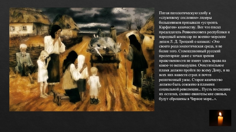 казачеству. Вот что писал председатель Реввоенсовета республики и народный комиссар по военно-морским делам Л. Д. Троцкий о казаках: «Это своего рода зоологическая среда, и не более того. Стомиллионный русский пролетариат даже с точки зрения нравственности не имеет здесь права на какое-то великодушие. Очистительное пламя должно пройти по всему Дону, и на всех них навести страх и почти религиозный ужас. Старое казачество должно быть сожжено в пламени социальной революции… Пусть последние их остатки, словно евангельские свиньи, будут сброшены в Черное море…».