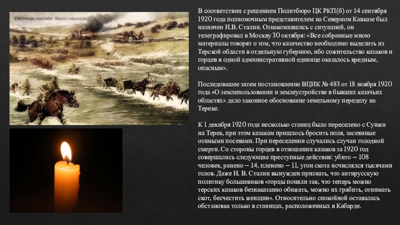 года полномочным представителем на Северном Кавказе был назначен И.В. Сталин. Ознакомившись с ситуацией, он телеграфировал в Москву 30 октября: «Все собранные мною материалы говорят о том, что казачество необходимо выделить из Терской области в отдельную губернию, ибо сожительство казаков и горцев в одной административной единице оказалось вредным, опасным».