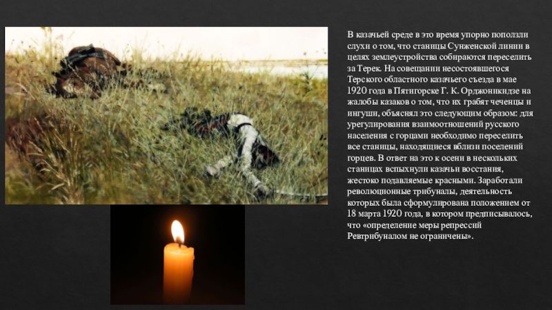 что станицы Сунженской линии в целях землеустройства собираются переселить за Терек. На совещании несостоявшегося Терского областного казачьего съезда в мае 1920 года в Пятигорске Г. К. Орджоникидзе на жалобы казаков о том, что их грабят чеченцы и ингуши, объяснял это следующим образом: для урегулирования взаимоотношений русского населения с горцами необходимо переселить все станицы, находящиеся вблизи поселений горцев. В ответ на это к осени в нескольких станицах вспыхнули казачьи восстания, жестоко подавляемые красными. Заработали революционные трибуналы, деятельность которых была сформулирована положением от 18 марта 1920 года, в котором предписывалось, что «определение меры репрессий Ревтрибуналом не ограничены».