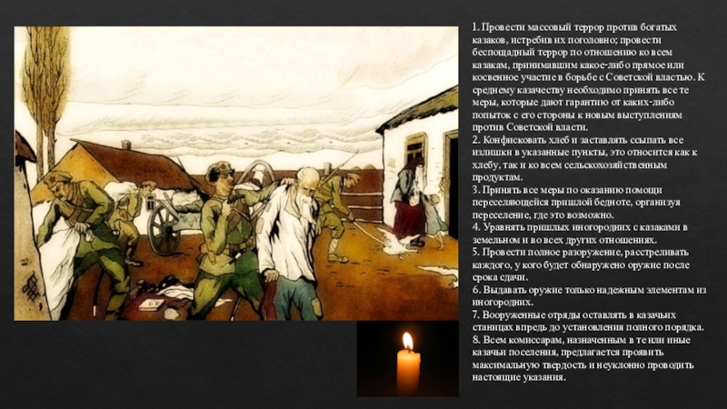 Слайд 71. Провести массовый террор против богатых казаков, истребив их поголовно; провести