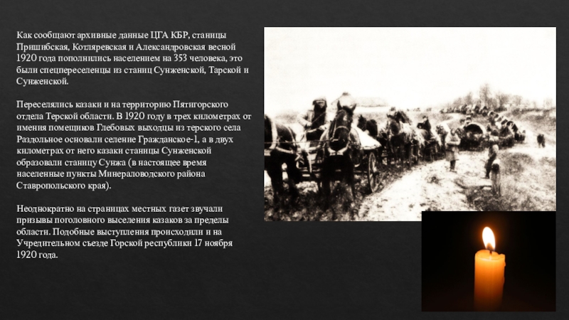 Слайд 23Как сообщают архивные данные ЦГА КБР, станицы Пришибская, Котляревская и Александровская