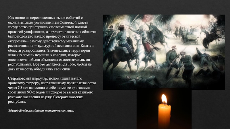 Свердловский циркуляр, положивший начало кровавому террору, направленному против казачества через 70 лет напомнил о себе не менее кровавыми событиями 90-х годов и исходом остатков казачьего русского населения из ряда Северокавказских республик.