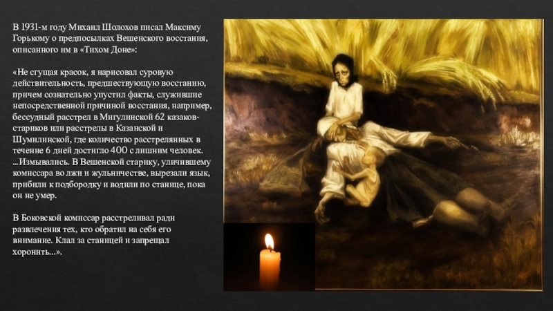Слайд 13В 1931-м году Михаил Шолохов писал Максиму Горькому о предпосылках Вешенского