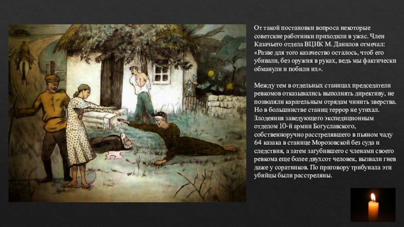 Казачьего отдела ВЦИК М. Данилов отмечал: «Разве для того казачество осталось, чтоб его убивали, без оружия в руках, ведь мы фактически обманули и побили их».