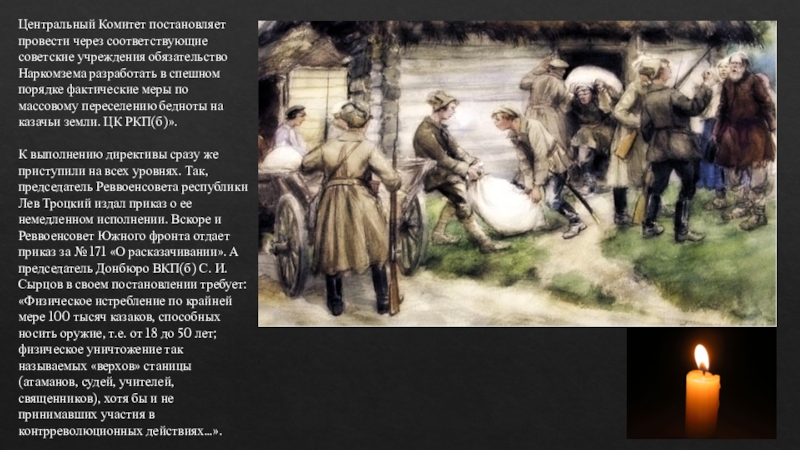 в спешном порядке фактические меры по массовому переселению бедноты на казачьи земли. ЦК РКП(б)».