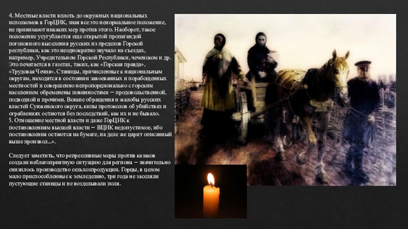 «Жизнь русского населения всех станиц, кроме находящихся в Кабарде, стала невыносима и идет к поголовному разорению и выживанию из пределов Горской республики: