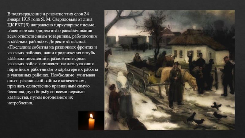 М. Свердловым от лица ЦК РКП(б) направлено циркулярное письмо, известное как «директива о расказачивании всем ответственным товарищам, работающим в казачьих районах». Директива гласила: