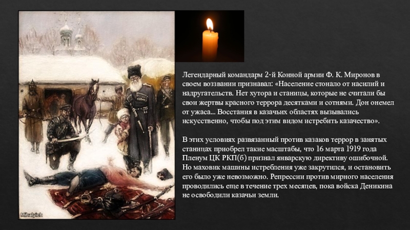признавал: «Население стонало от насилий и надругательств. Нет хутора и станицы, которые не считали бы свои жертвы красного террора десятками и сотнями. Дон онемел от ужаса… Восстания в казачьих областях вызывались искусственно, чтобы под этим видом истребить казачество».