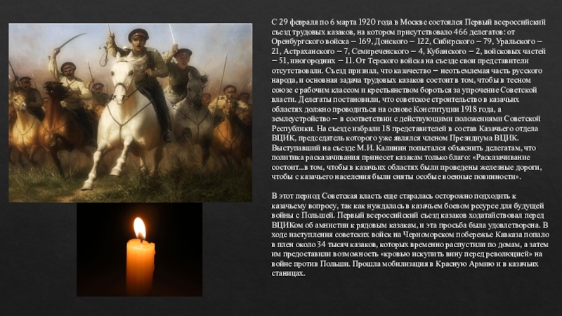 Первый всероссийский съезд трудовых казаков, на котором присутствовало 466 делегатов: от Оренбургского войска – 169, Донского – 122, Сибирского – 79, Уральского – 21, Астраханского – 7, Семиреченского – 4, Кубанского – 2, войсковых частей – 51, иногородних – 11. От Терского войска на съезде свои представители отсутствовали. Съезд признал, что казачество – неотъемлемая часть русского народа, и основная задача трудовых казаков состоит в том, чтобы в тесном союзе с рабочим классом и крестьянством бороться за упрочение Советской власти. Делегаты постановили, что советское строительство в казачьих областях должно проводиться на основе Конституции 1918 года, а землеустройство – в соответствии с действующими положениями Советской Республики. На съезде избрали 18 представителей в состав Казачьего отдела ВЦИК, председатель которого уже являлся членом Президиума ВЦИК. Выступавший на съезде М.И. Калинин попытался объяснить делегатам, что политика расказачивания принесет казакам только благо: «Расказачивание состоит…в том, чтобы в казачьих областях были проведены железные дороги, чтобы с казачьего населения были сняты особые военные повинности».