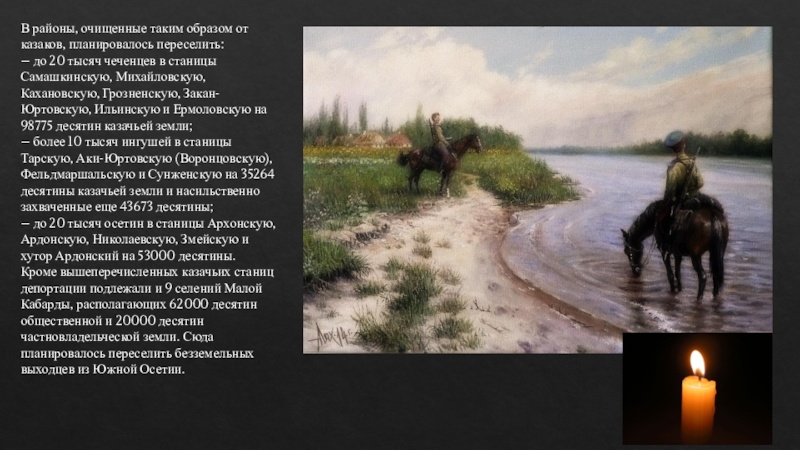 тысяч чеченцев в станицы Самашкинскую, Михайловскую, Кахановскую, Грозненскую, Закан-Юртовскую, Ильинскую и Ермоловскую на 98775 десятин казачьей земли;