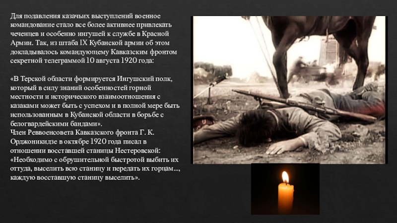 Член Реввоенсовета Кавказского фронта Г. К. Орджоникидзе в октябре 1920 года писал в отношении восставшей станицы Нестеровской: «Необходимо с обрушительной быстротой выбить их оттуда, выселить всю станицу и передать их горцам…, каждую восставшую станицу выселить».