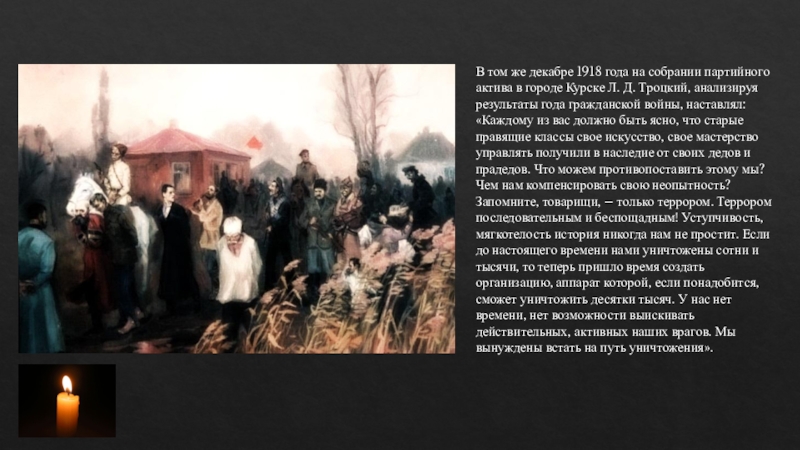 городе Курске Л. Д. Троцкий, анализируя результаты года гражданской войны, наставлял: «Каждому из вас должно быть ясно, что старые правящие классы свое искусство, свое мастерство управлять получили в наследие от своих дедов и прадедов. Что можем противопоставить этому мы? Чем нам компенсировать свою неопытность? Запомните, товарищи, – только террором. Террором последовательным и беспощадным! Уступчивость, мягкотелость история никогда нам не простит. Если до настоящего времени нами уничтожены сотни и тысячи, то теперь пришло время создать организацию, аппарат которой, если понадобится, сможет уничтожить десятки тысяч. У нас нет времени, нет возможности выискивать действительных, активных наших врагов. Мы вынуждены встать на путь уничтожения».