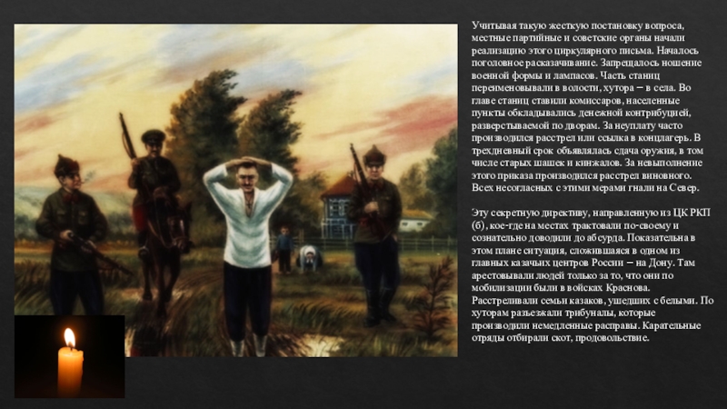 Эту секретную директиву, направленную из ЦК РКП (б), кое-где на местах трактовали по-своему и сознательно доводили до абсурда. Показательна в этом плане ситуация, сложившаяся в одном из главных казачьих центров России – на Дону. Там арестовывали людей только за то, что они по мобилизации были в войсках Краснова. Расстреливали семьи казаков, ушедших с белыми. По хуторам разъезжали трибуналы, которые производили немедленные расправы. Карательные отряды отбирали скот, продовольствие.