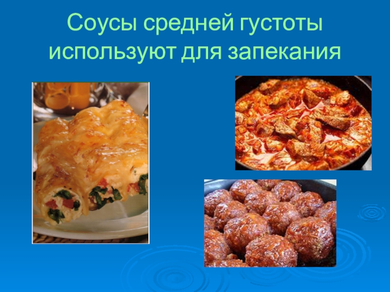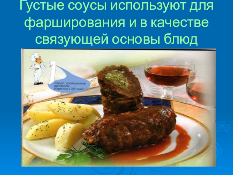 Слайд 10Густые соусы используют для фарширования и в качестве связующей основы блюд