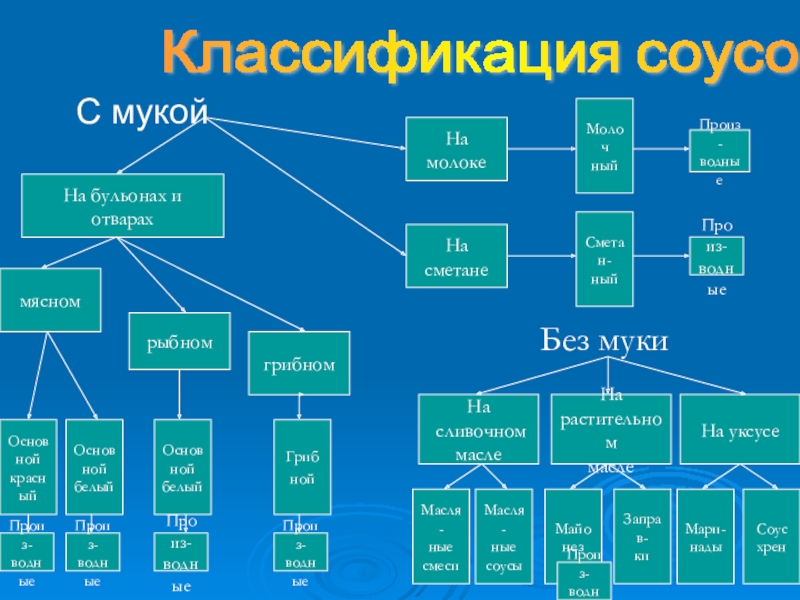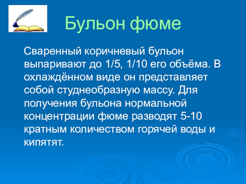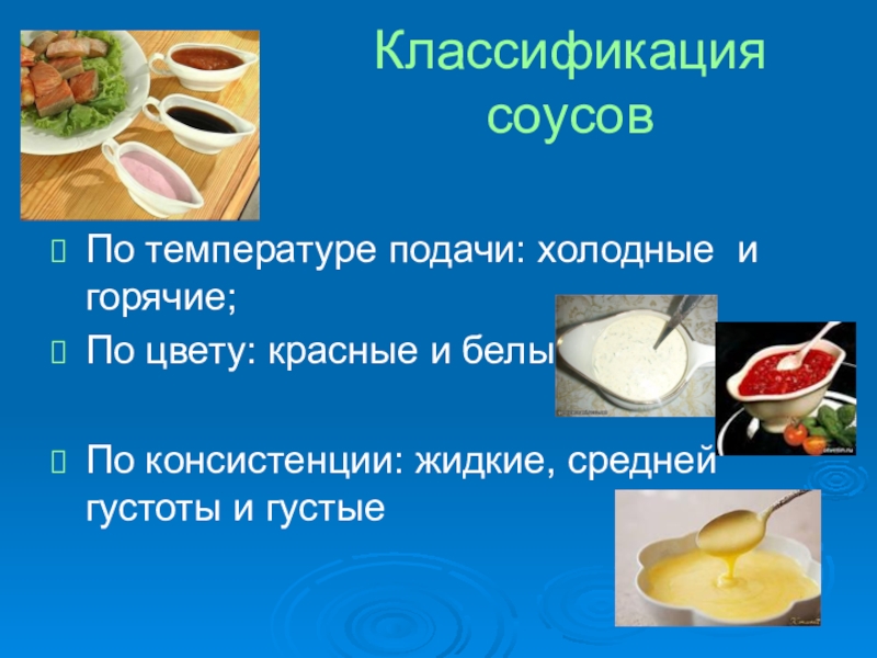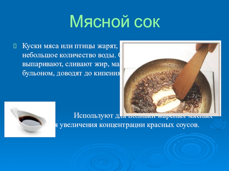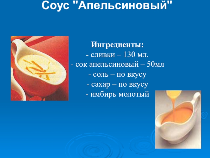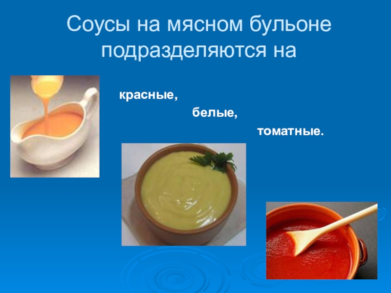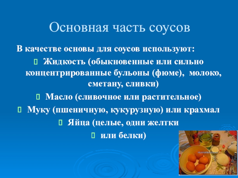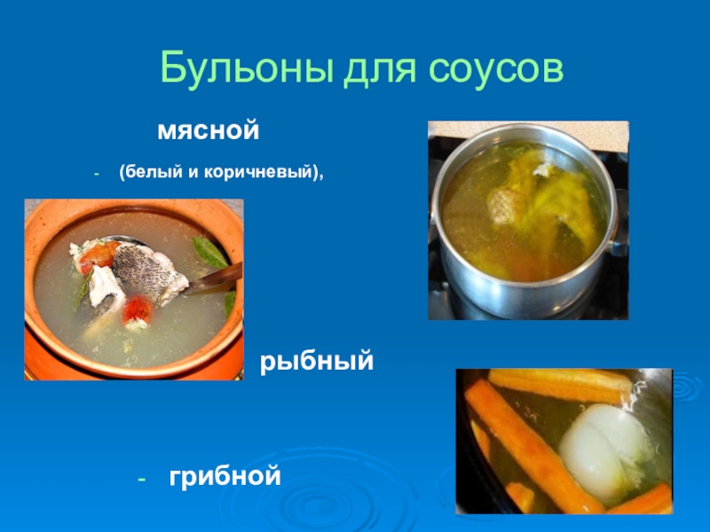 или сильно концентрированные бульоны (фюме), молоко, сметану, сливки)