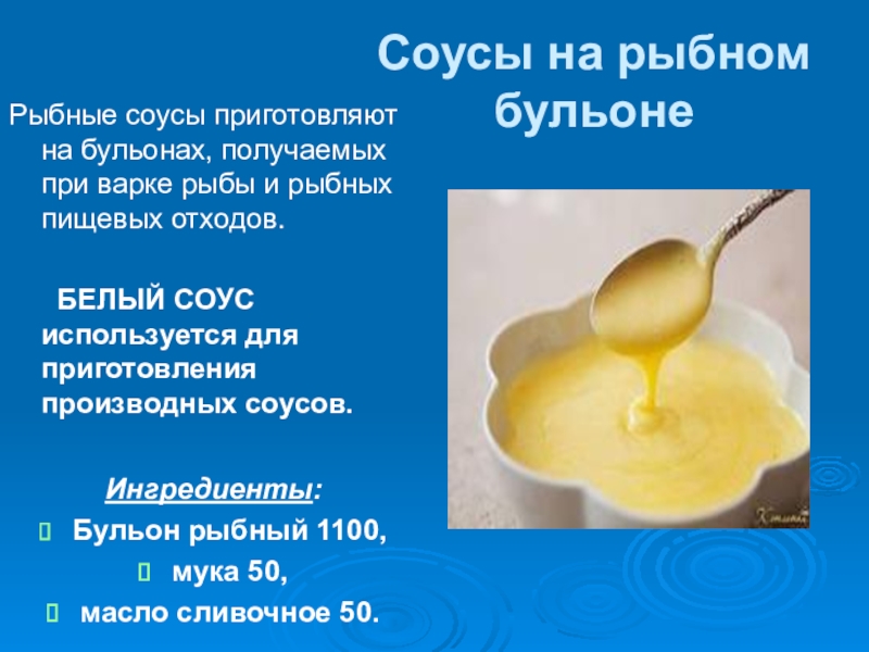 Рыбные соусы приготовляют на бульонах, получаемых при варке