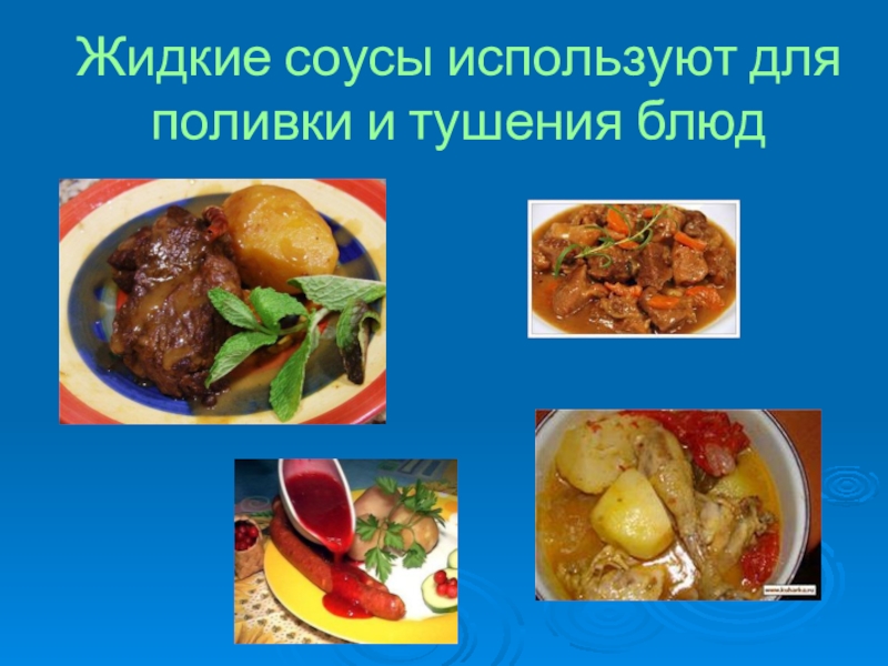 Слайд 8Жидкие соусы используют для поливки и тушения блюд