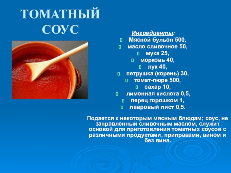Подается к некоторым мясным блюдам; соус, не заправленный сливочным маслом, служит основой для приготовления томатных соусов с различными продуктами, приправами, вином и без вина.