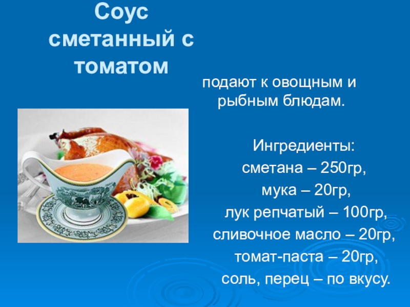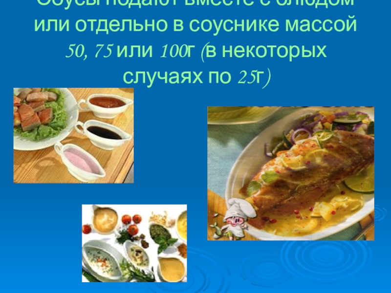 Слайд 52Соусы подают вместе с блюдом или отдельно в соуснике массой 50,
