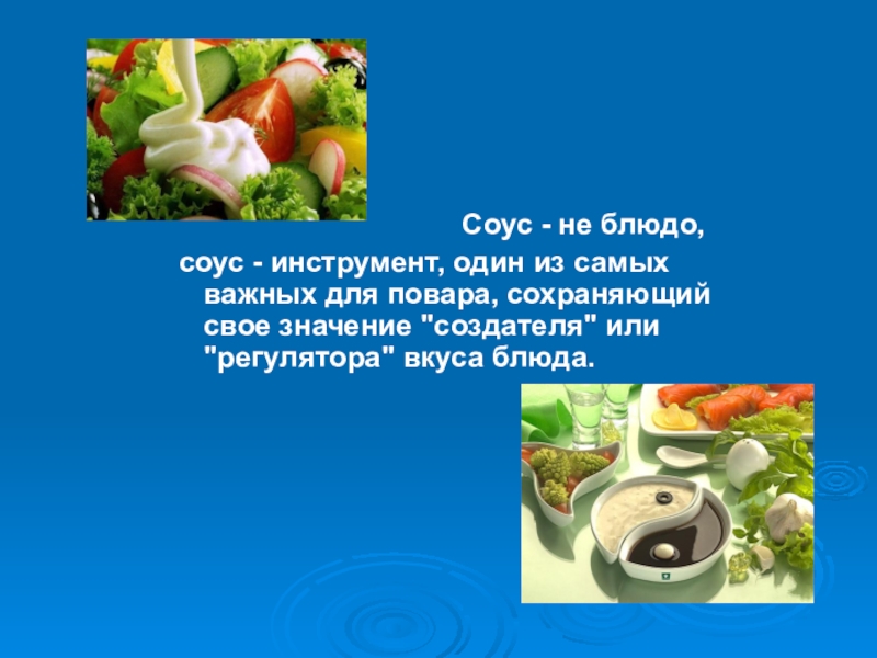 соус - инструмент, один из самых важных для повара, сохраняющий свое значение "создателя" или "регулятора" вкуса блюда.