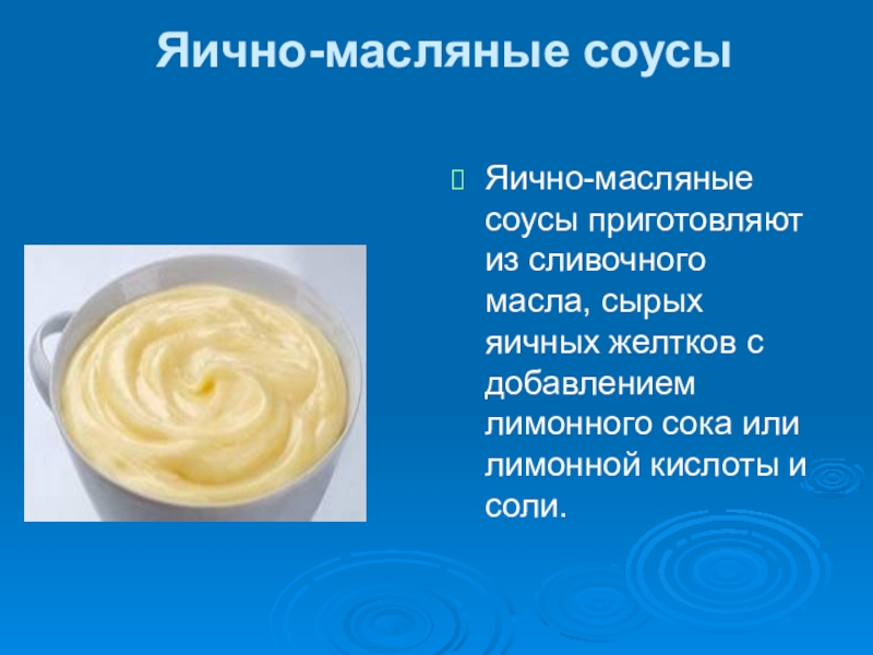 Яично-масляные соусы приготовляют из сливочного масла, сырых яичных желтков с