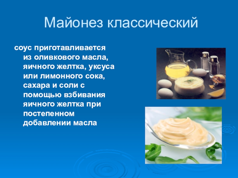 сока, сахара и соли с помощью взбивания яичного желтка при постепенном добавлении масла