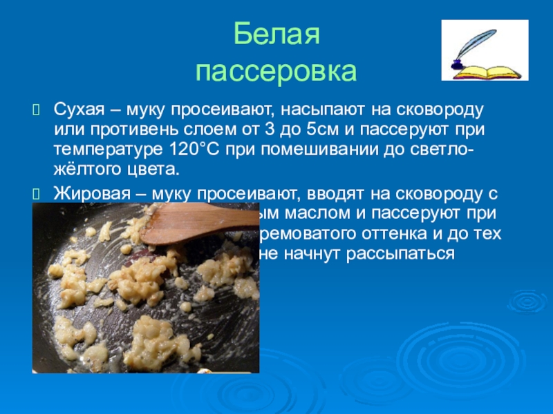 Жировая – муку просеивают, вводят на сковороду с растопленным сливочным маслом и пассеруют при температуре 120°С до кремоватого оттенка и до тех пор, пока комочки муки не начнут рассыпаться