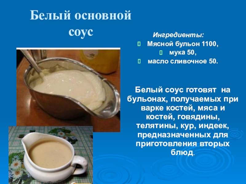 БЕЛЫЙ СОУС используется для приготовления производных соусов.