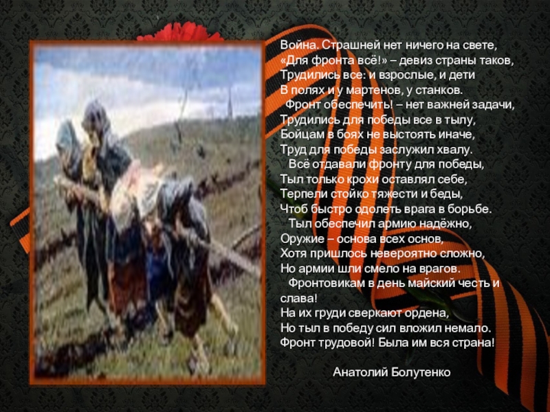 таков, Трудились все: и взрослые, и дети В полях и у мартенов, у станков.  Фронт обеспечить! – нет важней задачи, Трудились для победы все в тылу, Бойцам в боях не выстоять иначе, Труд для победы заслужил хвалу.  Всё отдавали фронту для победы, Тыл только крохи оставлял себе, Терпели стойко тяжести и беды, Чтоб быстро одолеть врага в борьбе.  Тыл обеспечил армию надёжно, Оружие – основа всех основ, Хотя пришлось невероятно сложно, Но армии шли смело на врагов.  Фронтовикам в день майский честь и слава! На их груди сверкают ордена, Но тыл в победу сил вложил немало. Фронт трудовой! Была им вся страна! Анатолий Болутенко
