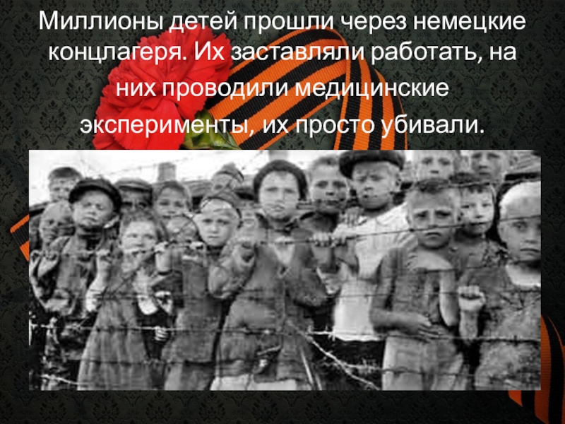 Слайд 7Миллионы детей прошли через немецкие концлагеря. Их заставляли работать, на них