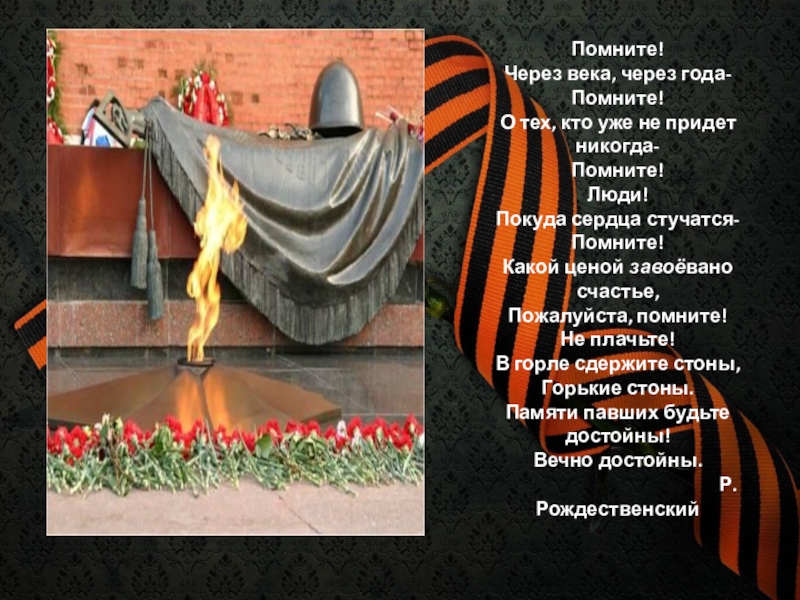 стучатся- Помните! Какой ценой завоёвано счастье, Пожалуйста, помните! Не плачьте! В горле сдержите стоны, Горькие стоны. Памяти павших будьте достойны! Вечно достойны. Р.Рождественский