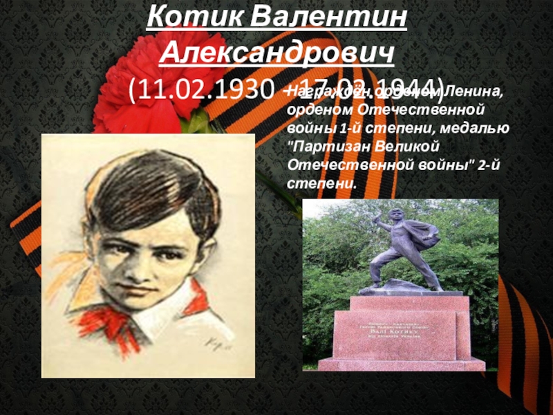 Котик Валентин Александрович    (11.02.1930 - 17.02.1944)Награждён орденом Ленина, орденом Отечественной войны 1-й степени, медалью