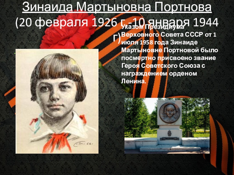 Зинаида Мартыновна Портнова (20 февраля 1926 г.-10 января 1944 г).Указом Президиума Верховного Совета СССР от 1 июля