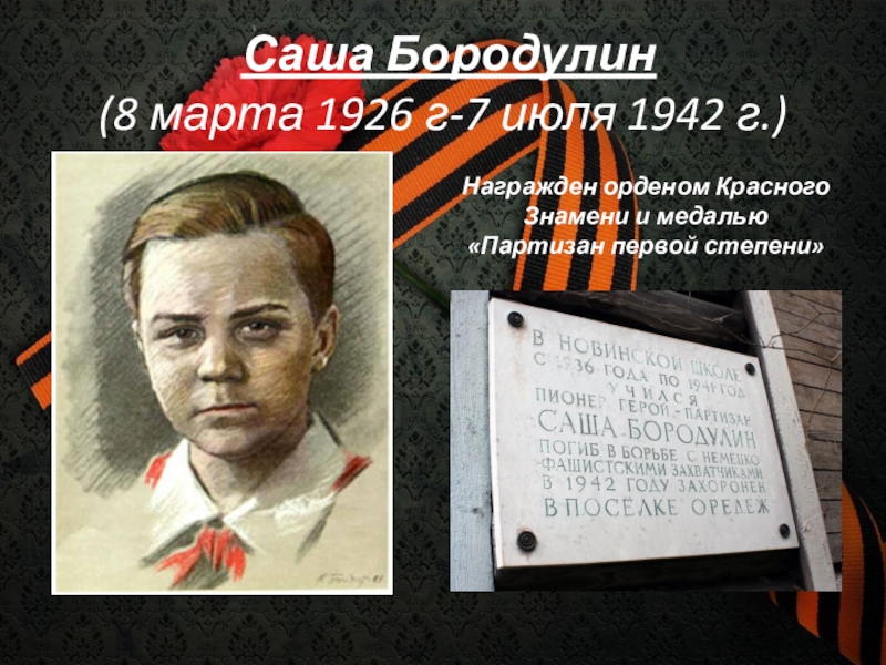 Саша Бородулин (8 марта 1926 г-7 июля 1942 г.)Награжден орденом Красного Знамени и медалью «Партизан первой