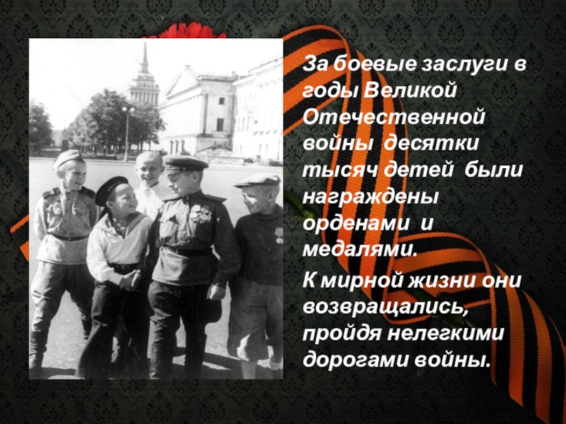 Слайд 14За боевые заслуги в годы Великой Отечественной войны десятки тысяч детей