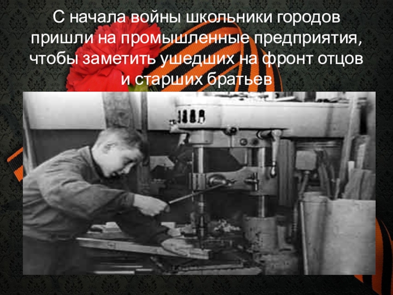 Слайд 3С начала войны школьники городов пришли на промышленные предприятия, чтобы заметить