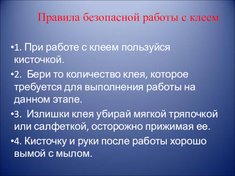 Правила безопасной работы с клеем1. При работе с клеем пользуйся кисточкой.2. Бери