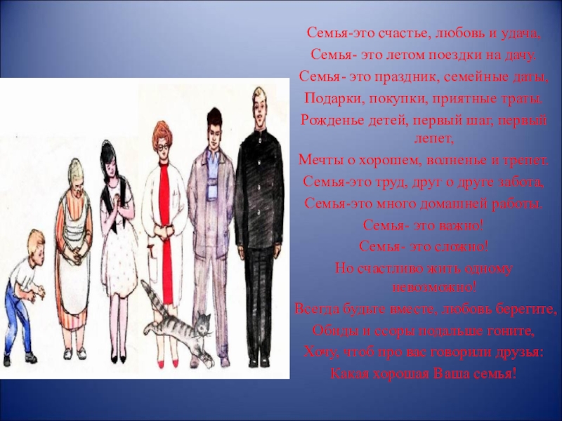 Семья-это счастье, любовь и удача,Семья- это летом поездки на дачу.Семья- это праздник, семейные даты,Подарки, покупки, приятные траты.Рожденье