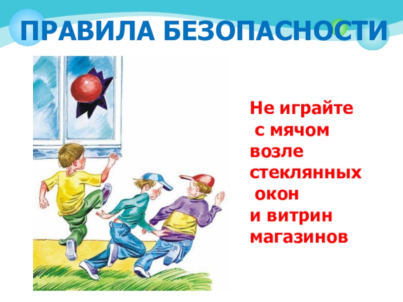 Не играйте с мячом возле стеклянных окон и витрин магазиновПРАВИЛА БЕЗОПАСНОСТИ