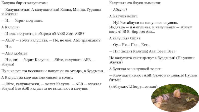 — Калушата не яют АБВ! Зюмо некузявые! Пуськи бятые!
