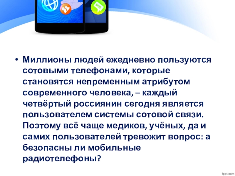человека, – каждый четвёртый россиянин сегодня является пользователем системы сотовой связи. Поэтому всё чаще медиков, учёных, да и самих пользователей тревожит вопрос: а безопасны ли мобильные радиотелефоны?