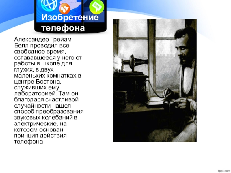 от работы в школе для глухих, в двух маленьких комнатках в центре Бостона, служивших ему лабораторией. Там он благодаря счастливой случайности нашел способ преобразования звуковых колебаний в электрические, на котором основан принцип действия телефона