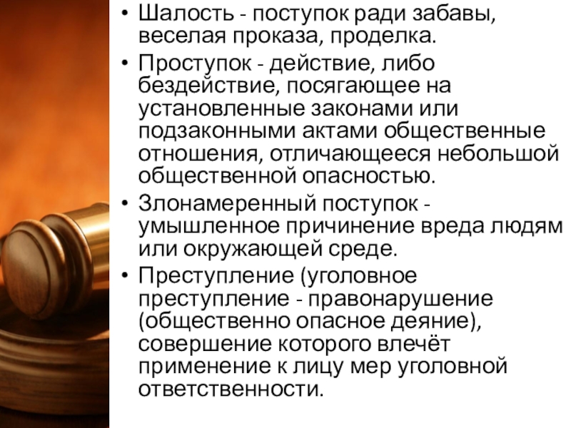 Шалость - поступок ради забавы, веселая проказа, проделка.Проступок - действие, либо бездействие, посягающее на установленные законами или подзаконными актами общественные отношения, отличающееся небольшой общественной опасностью.Злонамеренный поступок - умышленное причинение вреда людям или окружающей среде.Преступление (уголовное преступление