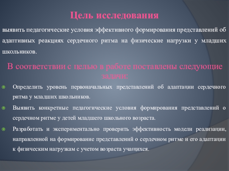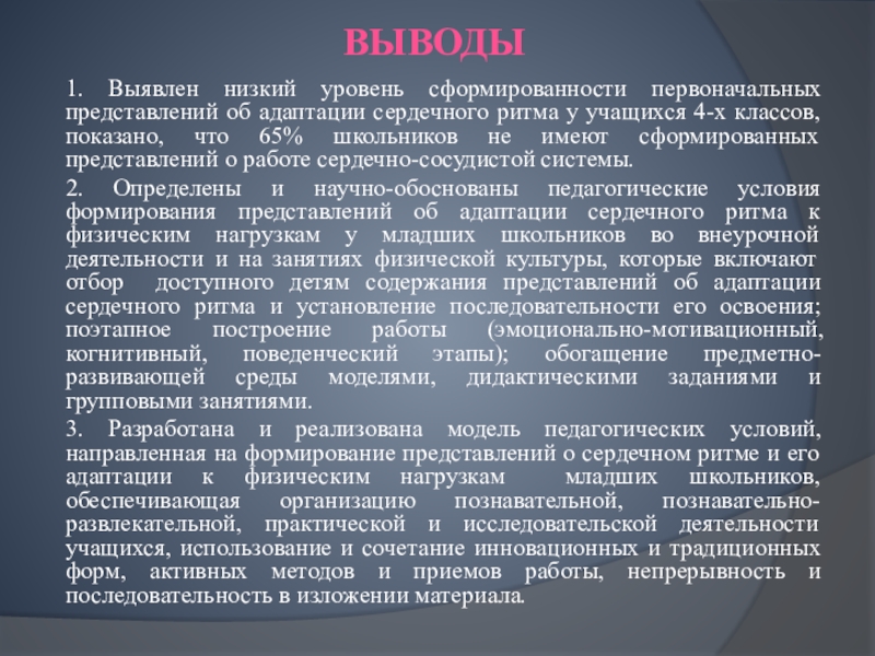 выявить педагогические условия эффективного формирования представлений об адаптивных реакциях сердечного ритма на физические нагрузки у младших школьников.