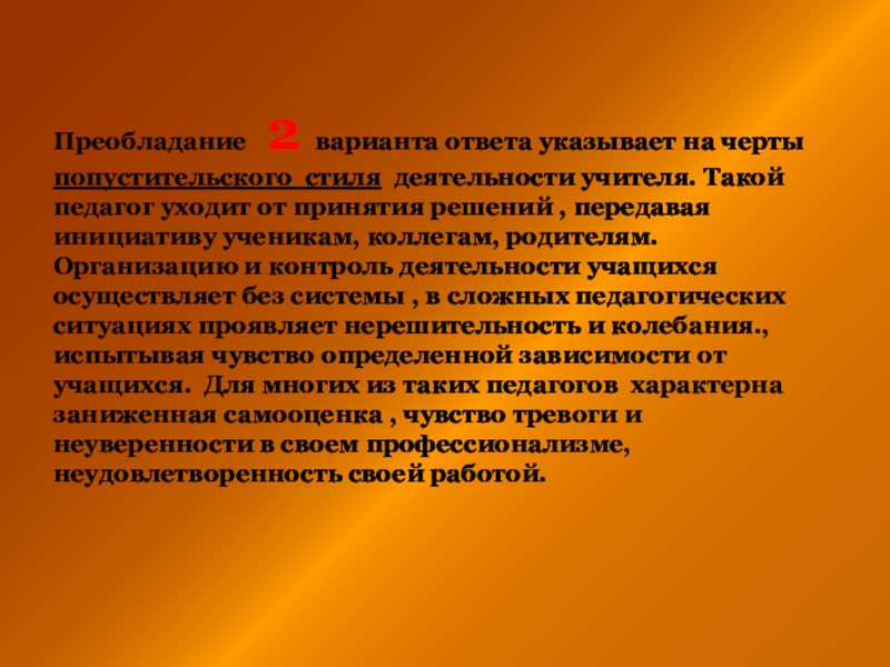 Слайд 19Преобладание 2 варианта ответа указывает на черты попустительского стиля деятельности учителя. Такой педагог уходит