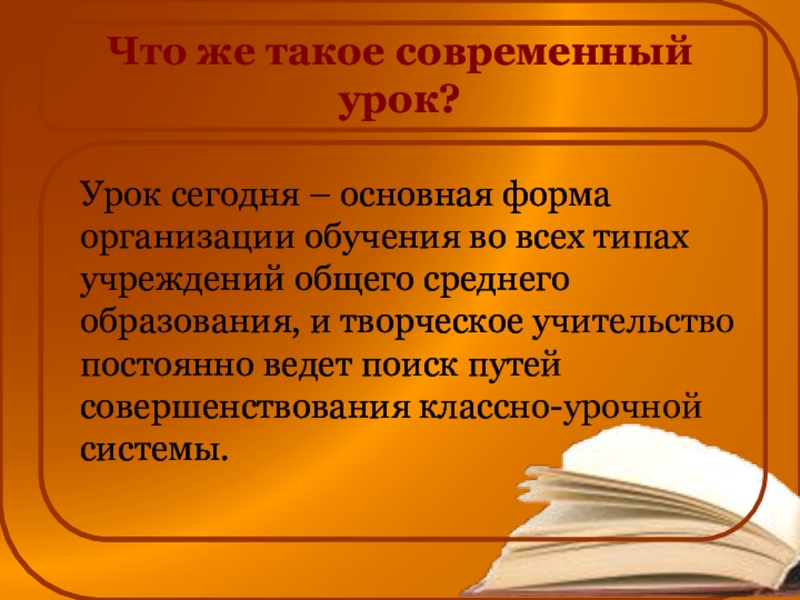 и содержание образования, появляются новые средства и технологии обучения, но УРОК остаётся вечной и главной формой обучения. На нём держалась традиционная и стоит современная школа.